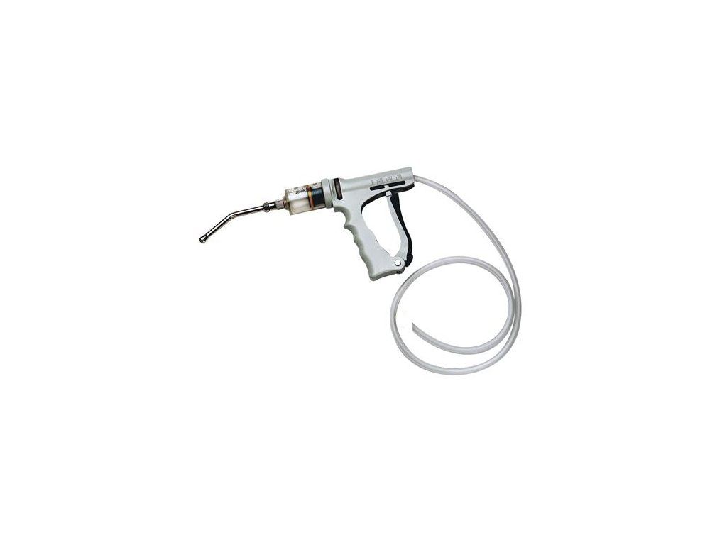 - Samostatný automatický drencher o objemu válce 30 ml s nasávací hadičkou pro perorální podávání léčiv či živinových přípravků zvířatům.