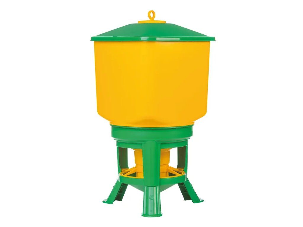 Plastové barelové krmítko na nohách pro drůbež.