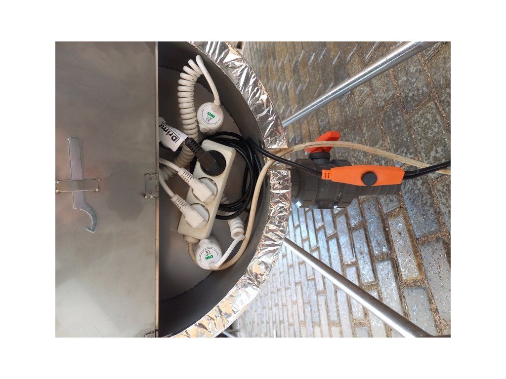 - Přívod 3/4". Vstup přívodní trubky je zespodu, zvířata se k přívodu a topnému kabelu nedostanou