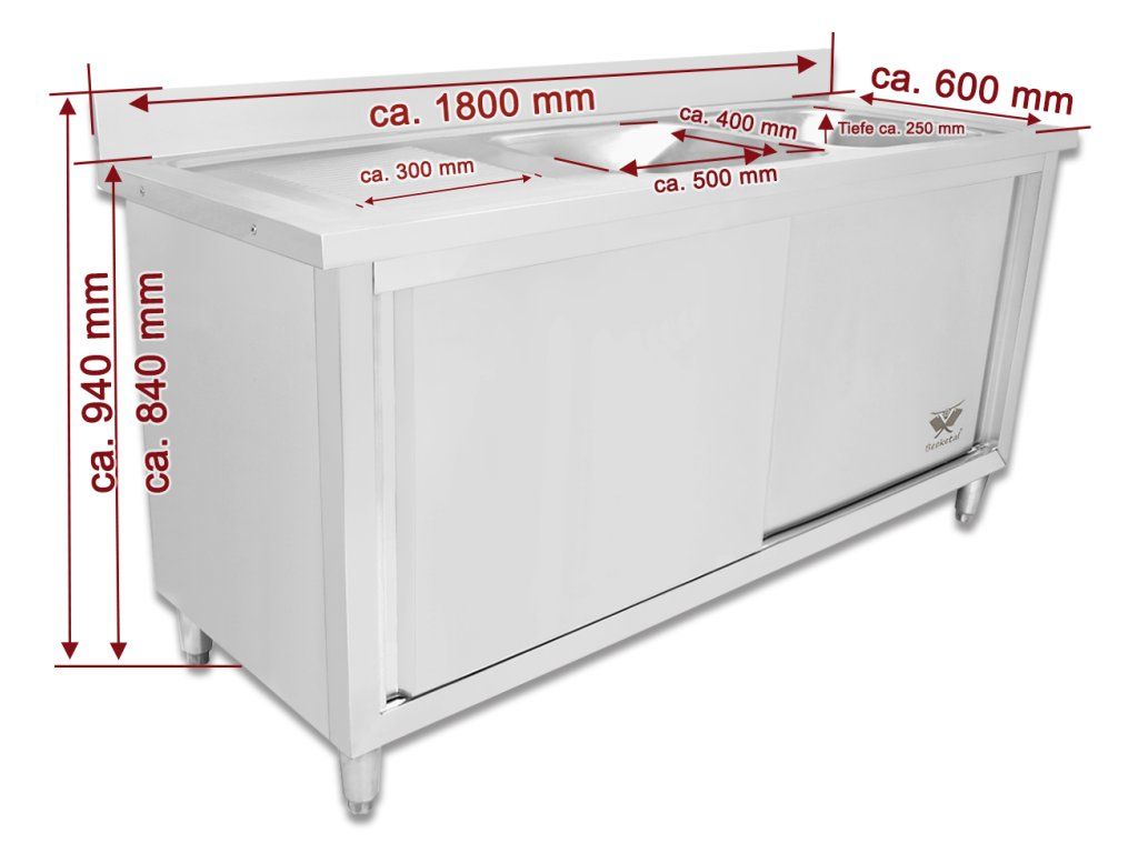 - Mycí stůl 180 x 600 x 850 mm, 2 dřezy o velikosti 500 x 400 mm s odkládací plochou a se skříní.