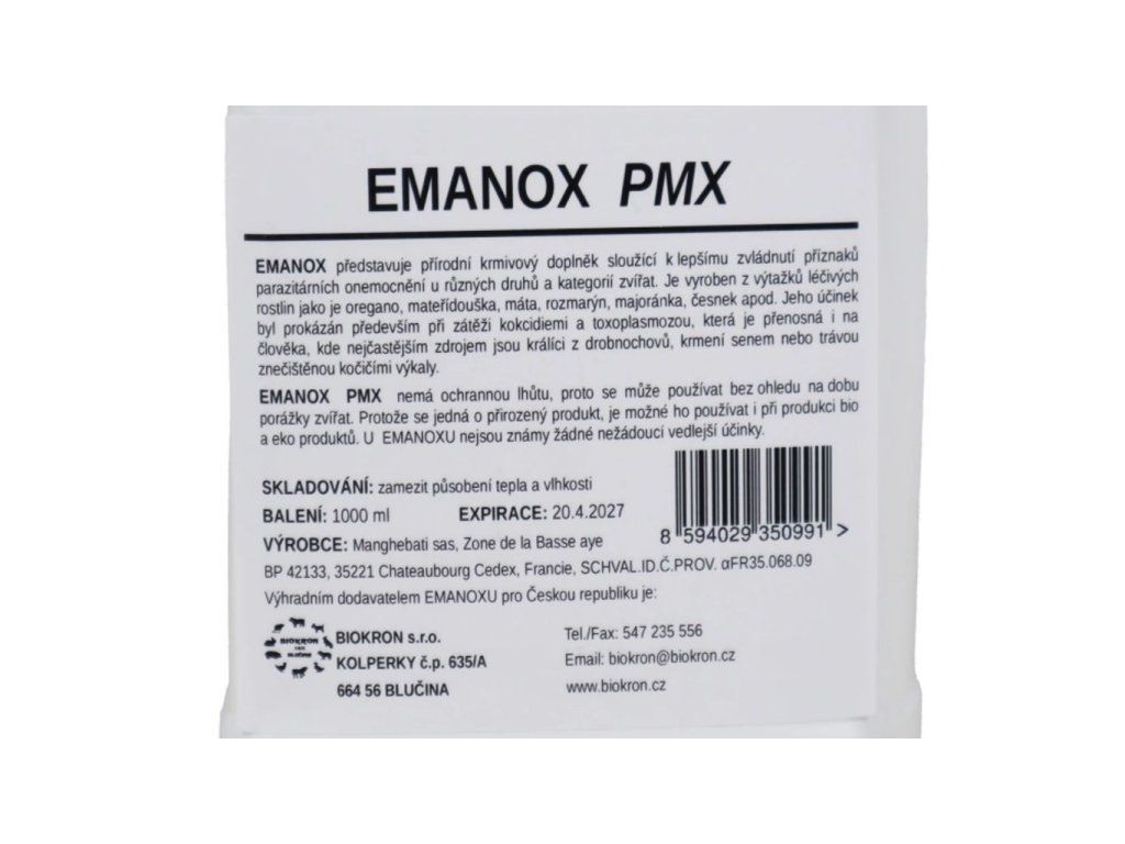 (oregáno, mateřídouška, máta, rozmarýn, majoránka, česnek apod.) - EMANOX PMX se používá k prevenci i léčbě kokcidiózy u všech druhů zvířat, zejména však králíků, drůbeže a malých přežvýkavců – telat, jehňat a kůzlat.