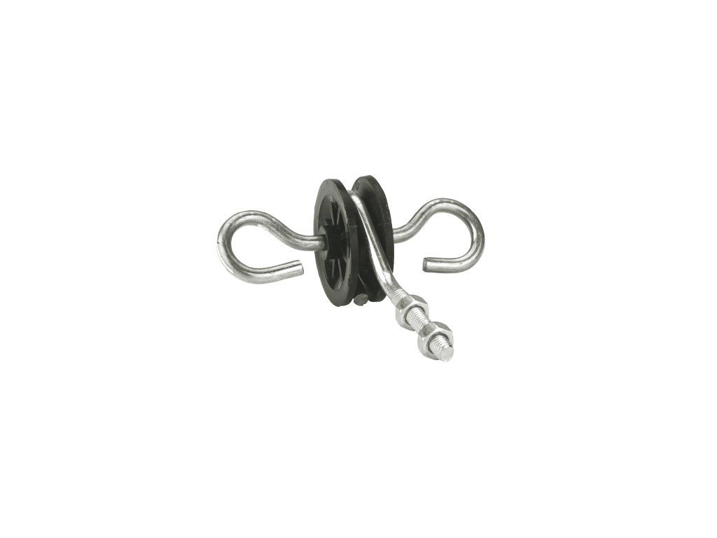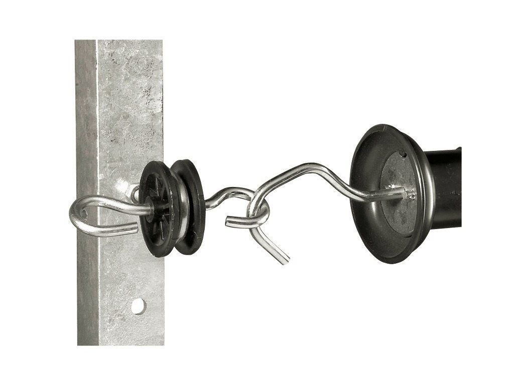 - Koncový izolátor je doplněn dvěma kovovými oblouky. Na jeden lze připojit koncový vodič ohrady a na druhý se zahákne háček z vchodové branky.