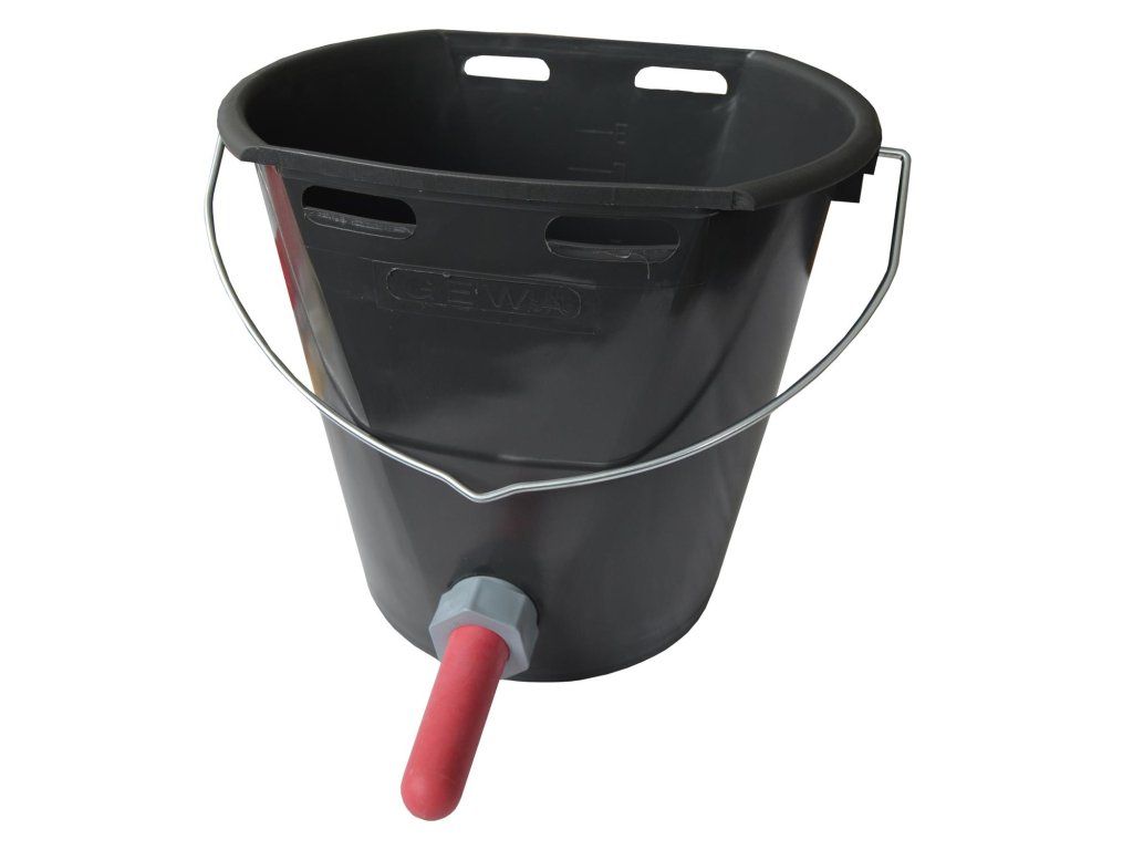 Plastový napájecí kbelík po telata se stupnicí do 8 l, černý, včetně zpětného ventilu a červeného dudlíku.