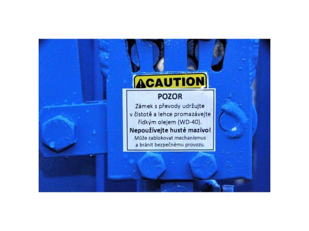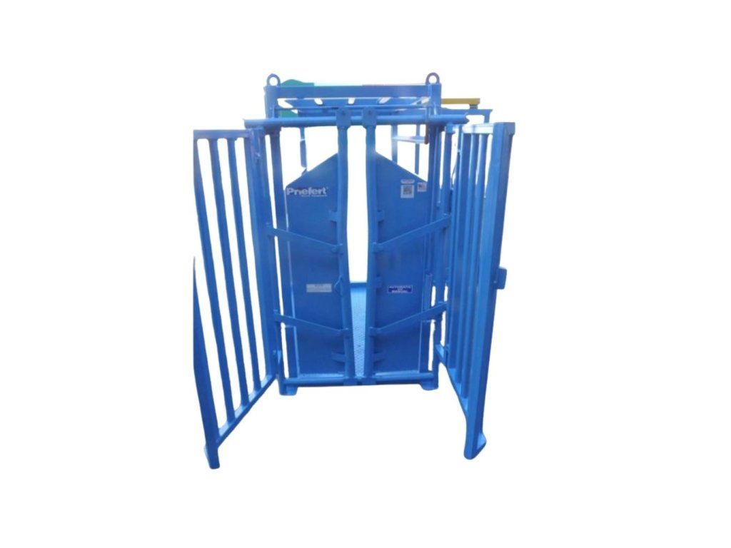 - Pro fixaci skotu je použité originální osvědčené čelo Priefert, páka čela je prodloužena a čelo lze spustit ručně a přitom ovládat zadní posuvné dveře. Při ručním spouštění fixace je obsluha v zadní části klece a neruší zvíře u hlavy.