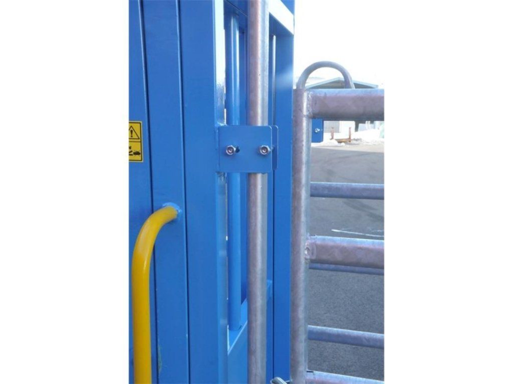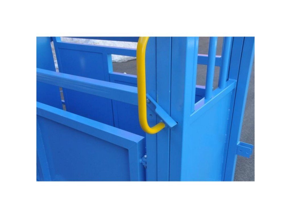 - Posuvné dveře mají velmi lehký chod. Jejich konstrukce zamezí vycouvání zvířete již při částečném přivření dveří. Proti samovolnému otevření, jsou dveře opatřeny západkou. Zadní příčky lze jednoduše vyjmout bez použití nářadí, tím je umožněn pohodlný přístup pro zjišťování březostí a odběry krve. Spodní výplň dveří chrání obsluhu proti kopnutí.