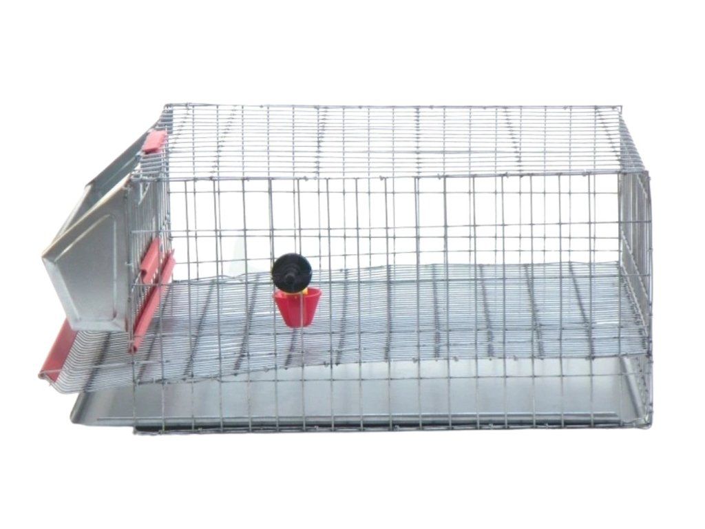 - Součástí klece je vnější závěsný žlab na krmivo a automatická napaječka