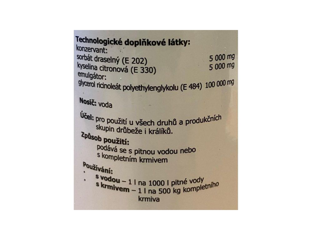 - Drůbež: 1 ml na 1 litr pitné vody po dobu 3-4 dnů opakovat každé 4 týdny