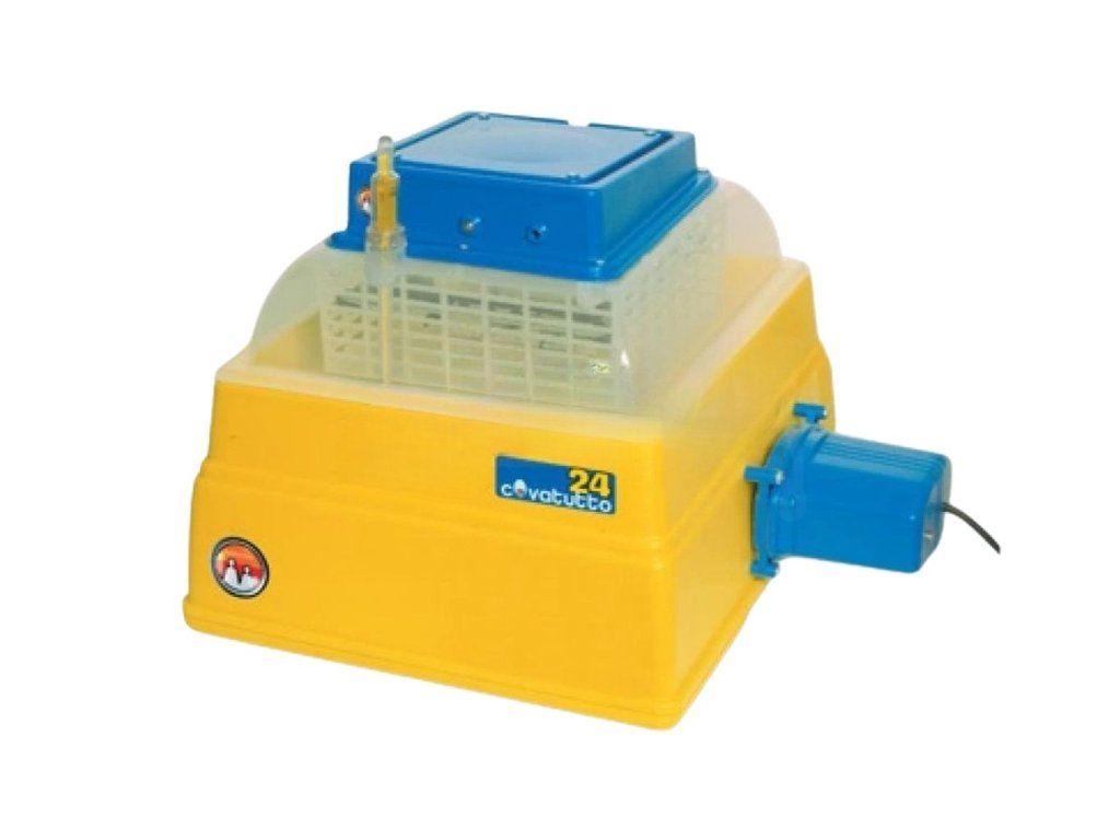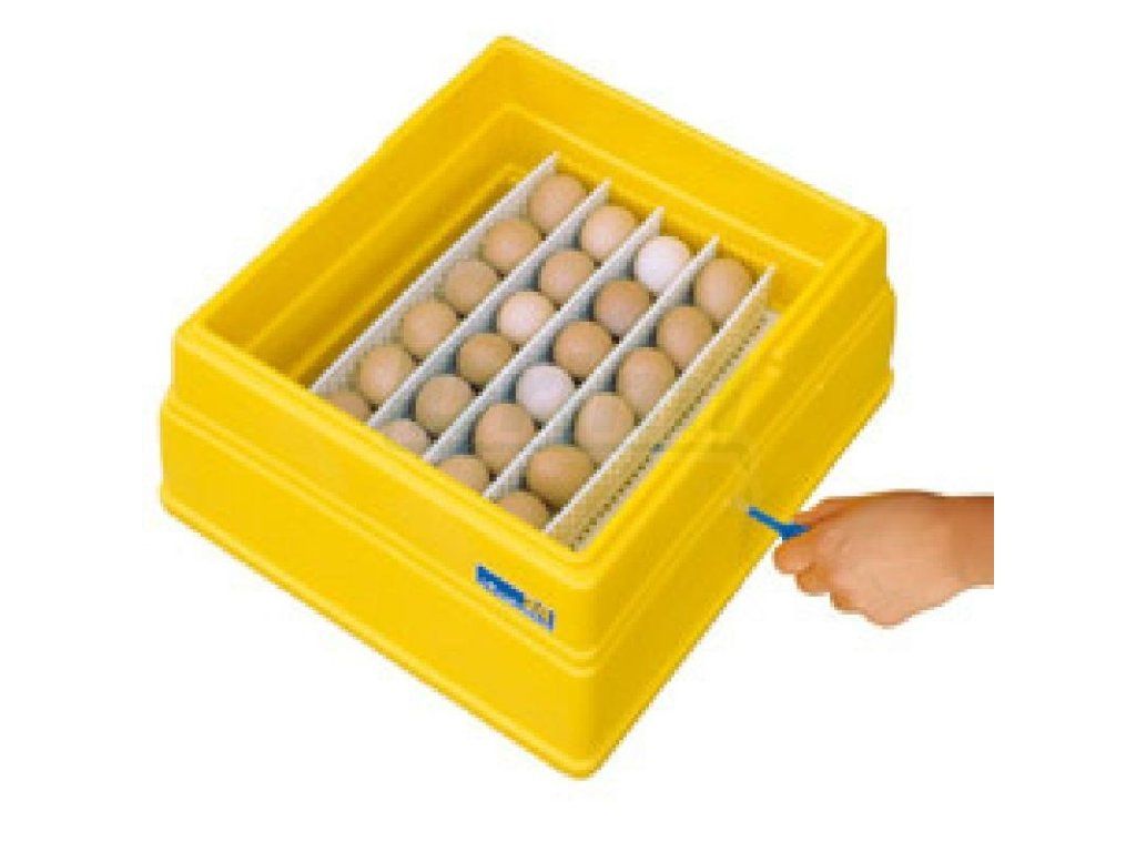 Plně automatická líheň Covatutto 24 s analogovým termostatem pro 2O - 24 slepičích, 20 kačeních, 6 husích, 16 krůtích, 30 bažantích, 70 křepelčích vajec. Technicky pokročilá líheň s jmenovitým příkonem 80W, 230V, 50Hz v automatickém provedení. Osvědčená dvouplášťová konstrukce spodního dílu z odolného plastu je navíc vyplněna polystyrenem. To zajišťuje dobrou izolaci a nízkou spotřebu líhně. K inkubátoru je v externím balení přidán motorek, který automaticky vajíčka otáčí a člověk nemusí obsluhovat inkubátor ručně. Motor má příkon 3W, převodovka zpomaluje rotační pohyb a převádí ho jednoduchou vačkou na pohyb axiální. Díky pohybu vačky je pohyb dna nepravidelný a má i klidovou fázi při přechodu zenitu. Táhlo motoru vykoná pohyb tam a zpět 12 x za 24 hodin. Jednoduchou montáž pomocí kresleného návodu a 5 šroubů zvládne každý. Vajíčka se otáčejí díky pohyblivému dnu, která je přišroubované k táhlu motoru připevněnému k boku líhně. Při pohybu dna se vajíčka odvalují od dělících přepážek,lamel. Přepážky se vkládají podle velikosti vajec, ale dostatečně volně tak, aby se vajíčka mohla volně otáčet. Lamely je možné nastavit tak, aby vejce měla 2 – 5mm vůli. Kompaktní spodní díl líhně je vybaven nádržkou na vodu. Pro každou velikost líhně je plocha vodní hladiny přesně tak velká, aby se za konstantní teploty a proudění vzduchu udržovala optimální vlhkost v líhni. Voda se do výparníku doplňuje automaticky pomocí plováku. 10-ti litrový kanystr odmineralizované destilované vody Vám postačí na celou dobu inkubace. I vejce doporučujeme kropit destilovanou vodou, protože může dojít k úhynu zadušením následkem ucpání pórů! Proudění vzduchu a rovnoměrnou teplotu v celé líhni zajišťuje ventilátor, který běží, i když termostat vypne topení. Toto zajišťuje topný kabel v silikonové izolaci, stočený do spirály v rámečku kolem ventilátoru. Pokud topí, kontrolní dioda svítí zeleně, když zčervená, tak hlásí poruchu - poškozený kabel, častěji dlouhou dobu otevřené víko a přístroj nemůže dosáhnout určené teploty. Originální lihový teploměr vložíme do připraveného otvoru líhně. Pokud pod lupou teploměru nevidíte stupnici, pevně ho uchopte za spodní část a otočte jím, až bude stupnice vidět. Teploměr má stupnici ve °Fahrenheita a je vybaven pouze ke zjišťování vnitřní teploty, která je správná, pouze když se rtuť dotýká rysky 100°F tj. (37,8°C). 1 dílek = 1°F. Rozsah nastavení analogového termostatu je 25 - 45°C, spínání je v rozsahu +-0,1°C. Je velmi spolehlivý. Teploměr je funkční, pokud je rtuť sjednocená. Firma Driml Vám kromě odborného servisu nabízí přesný líhňový teploměr s dělením po 0,1°C s červeně vyznačenou ryskou na 37,8°C (100°F). Teploměr má tvar L a dá se k líhním COVATUTTO bez problémů použít. Nejvhodnější instalace tohoto teploměru je pomocí 3 kusů plastových rychloupínacích pásek, přičemž stupnici teploměru upneme pod plastový kryt k bílé mřížce vodorovně, co nejvýše ke krytu a čidlo s rtuťovou jímkou skloníme přes roh mřížky k jejímu spodnímu okraji. Tím zajistíme snímání teploty ze stejné výšky jako originál, teploměr je dobře krytý a nehrozí jeho poškození při odstavení krytu na stůl při manipulaci. Dva dny před ukončením inkubace vypneme motor v okamžiku když je pohyblivé dno v jedné z úvratí, vyjmeme vejce i lamely, jednou lamelou doplníme dno a na rošt položíme čisté plátno nebo filtrační papír, vejce volně naskládáme zpět a dokončíme líhnutí. Je dobré v tomto stadiu vejce pokropit vlažnou vodou. Možnost připojení záložního zdroje NZ UNI 150 pro případ výpadku el. sítě
