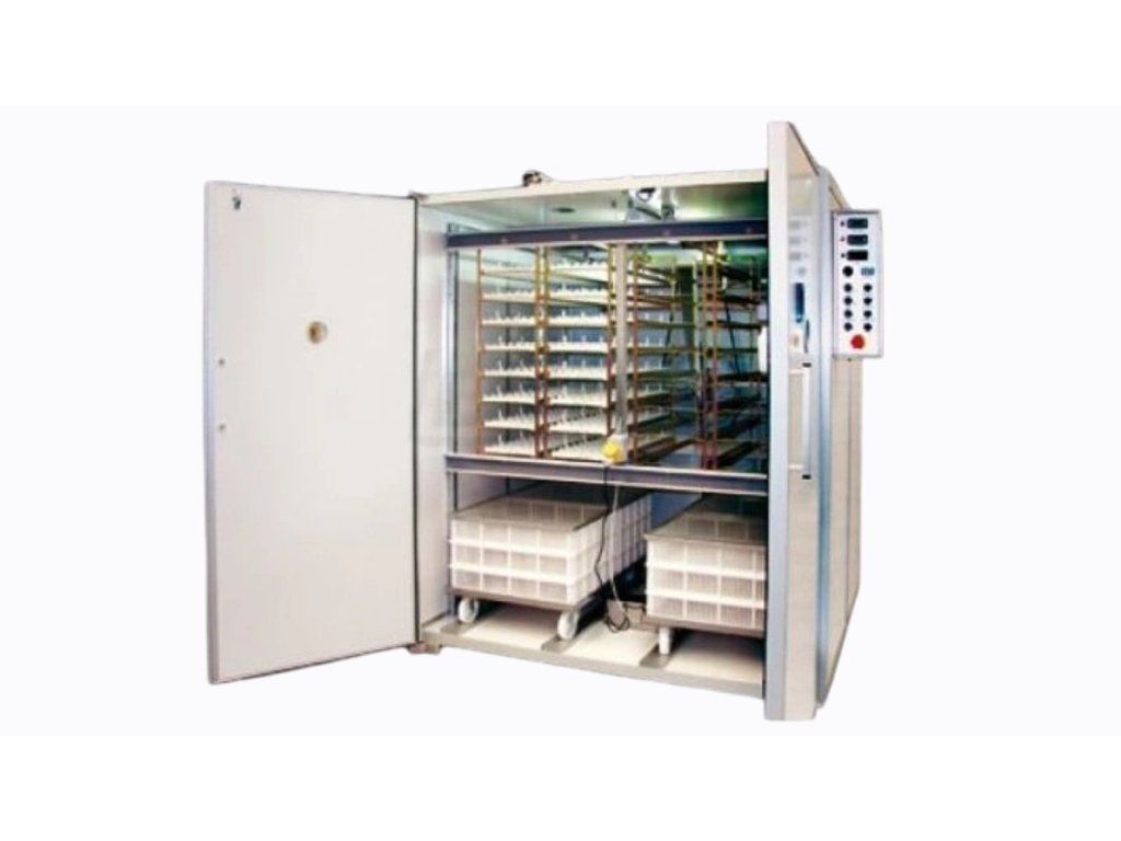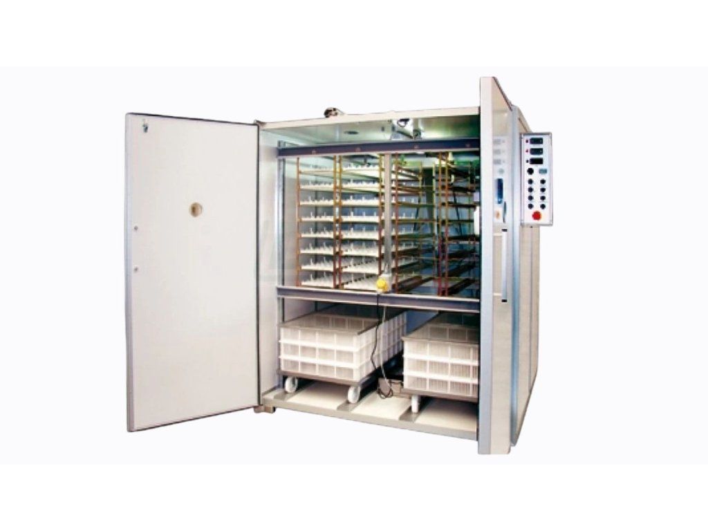Líheň MG 6100 SH je zcela profesionální, velmi technicky vyspělý inkubátor, které jsou speciálně navržen tak, aby mohl pracovat v týdenním cyklu. Tento model inkubátoru kombinuje dostatečný počet vajec s řadou inovativních systémů které uživateli dovolí bezpečný a efektivní provoz! Současně s jednoduchým ovládáním dosahuje optimálního výkonu inkubace a líhnutí. Rozměry v mm: 2130x1950x2430 výška. Váha 550kg. Jmenovitý příkon 1200W. Průměrná spotřeba el. energie za 24 hodin cca 40 kWh Napájení 220 - 230V, 50Hz. Záložní regulační a topný systém pro případ poruchy na hlavním panelu nebo topné spirále. Alarm. Inkubační částí líhně nazýváme výkyvné kontejnery - plata, kde probíhá inkubace vajíčka - u slepic 1 - 19 den, posléze se musí vajíčka ručně přemístit do kontejnerů ve spodní části - dolíhně - hatcheru, kde probíhá poslední fáze inkubace. Zde se již, 20 - 21 den vajíčka neotáčejí, nastává vlastní líhnutí. Počty vajíček – v inkubátoru + v líhni : slepice, kačena 4608+1536, bažant 5440+1814, koroptev 8064+2688, křepelka 10880+5440, krůta 3200+800, husa 1792+448. Automatické otáčení vajec v inkubátoru zajišťuje výklopný mechanismus, do kterého se vkládají speciální kontejnery s držáky z vysoce kvalitního špičkového plastu určeného pro potravinářské účely. Tyto kontejnery jsou typizované pro řadu profesionálních inkubátorů. Vlastní pohyb embrya ve vajíčku je zajištěn plynulým naklápěním kontejnerů ze strany na stranu a napomáhá řádnému vývoji embrya a předchází nebezpečným srůstům s vaječnou skořápkou. Vysokou kvalitu zajišťuje špičkové elektronika v digitálním provedení, součástí je vizuální a akustická signalizace - alarm při teplotních abnormalitách - systém samozřejmě zastaví topení, je-li překročen maximální teplotní limit. Chlazení: vodní systém je řízen solenoidem - oběh studené vody, ventilátor. Díky tomu, že je k dispozici druhý okruh nouzového topení a elektromechanický termostat nezávislý na hlavním ovládacím panelu (záložní systém), je možné obnovit hlavní funkce stroje v případě poruchy na hlavním panelu. Vzhledem k jmenovitému příkonu stroje: 2800W se nevyplatí investovat do akumulátorového záložního zdroje - měniče, ale je mnohem výhodnější pořídit vhodnou elektrocentrálu pro nouzové napájení líhně a případných odchoven, tepelných zdrojů a ventilátorů! Vlastní konstrukce líhně je z lakovaného, pozinkovaného ocelového plechu, který obestavuje 40mm polyuretanové desky. Kromě snadného a kompletního čištění především zajišťují stálou teplotu uvnitř přístroje, dokonalou izolaci a pevnost přístroje. Okénko ve dveřích a vnitřní osvětlení zajišťuje průhled do prostoru inkubátoru. Horizontální ventilátor s plynulou regulací otáček pro rovnoměrné rozložení tepla a speciální zařízení zajišťuje intenzitu jemného větrání a odvod kysličníku uhličitého přes ventilační otvory. Digitální termostat vysoké kvality s desetinnou přesností umožňuje snadné nastavení. Automatické udržování relativní vlhkosti v různých fázích inkubace a líhnutí je realizováno pomocí cisterny s řízenou úrovní automatického odpařování vody - výparník s topným tělesem s řízenou teplotou. kontrolní odečet teploty prostřednictvím přesného suchého rtuťového teploměru ve °F a mokrý teploměr ve °F ve společném přístroji - psychrometru pro přesný odečet procent vlhkosti uvnitř líhně. Na přání a za příplatek je možné stroj dodat s ultrazvukovým zvlhčovačem s digitálním řízením. Tento systém využívá ultrazvukové atomizace vody a vytváří tzv. kouřový efekt aniž by se změnila provozní teplota. Při připojení k digitální řídící jednotce HYGROSTAT představuje dokonalý zvlhčovací systém pracující přesně podle požadavků chovatele. Tato líheň Vám nabízí opravdu vysokou kvalitu za bezkonkurenční cenu v porovnání s podobnými líhněmi na našem trhu ! Za příplatek je možné přístroj dodat s PLC řídícím systémem s dotykovým displejem