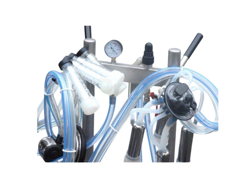 - Mléčná hadice, a dvojice vzduchových hadic je dlouhá 1,2 m po rozbočení k dvojici dojicích souprav. Koncovky hadic jsou dlouhé cca 1m. Dojicí soupravy se sacími ventily bez sběrače, umožňují postupné nasazování návleček na struky. Ovladač ventilu je na každém strukovém pouzdře.