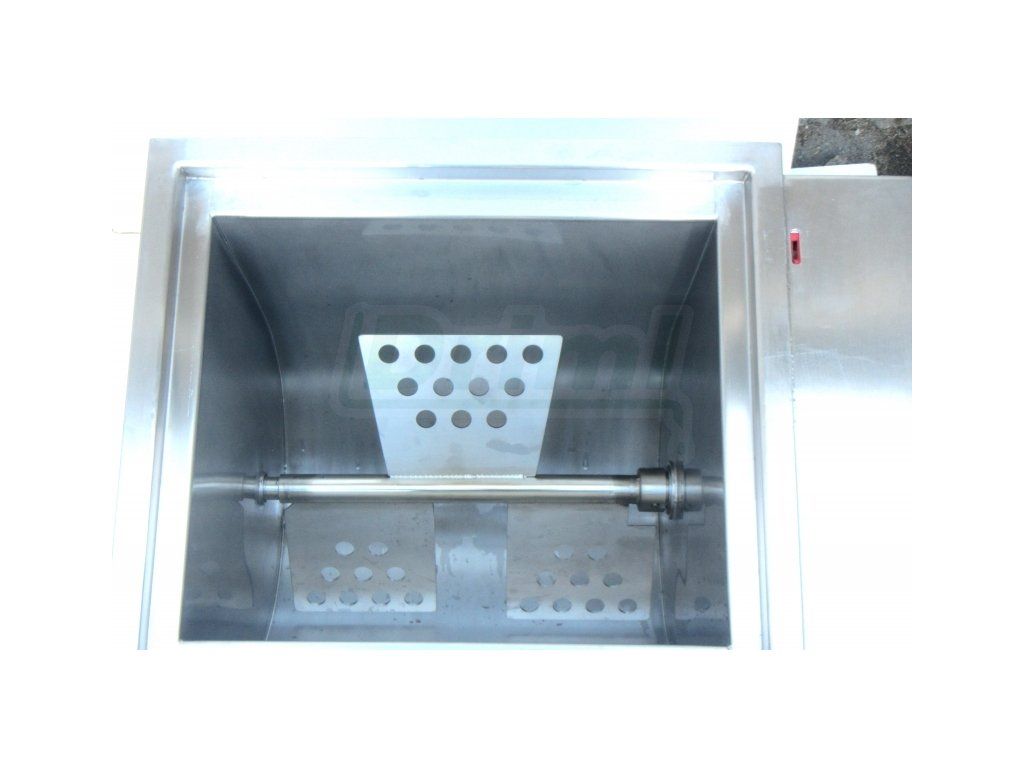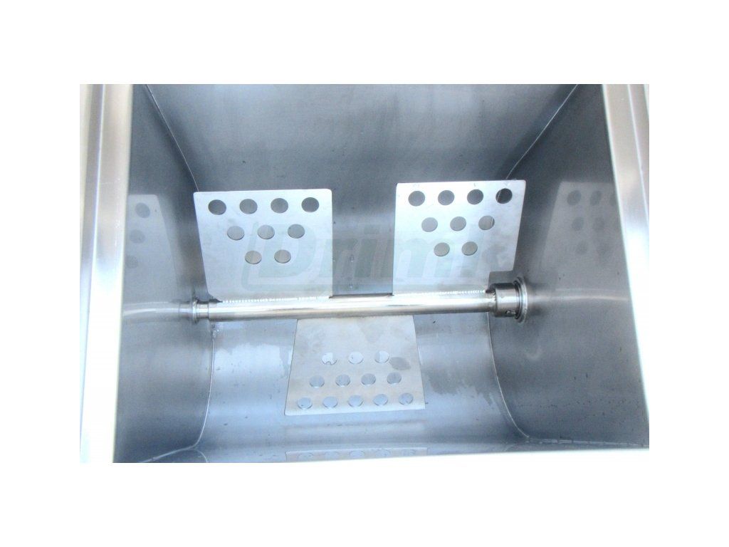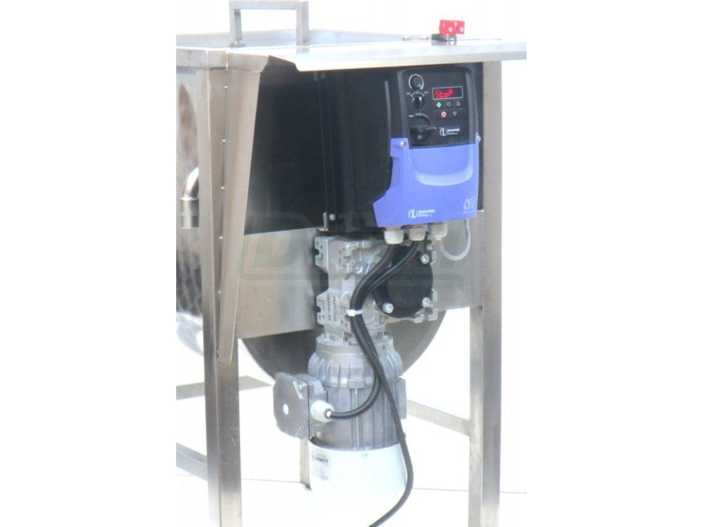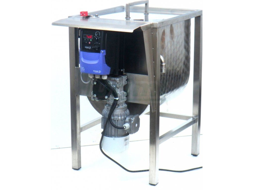 - V závislosti na teplotě smetany (od 10 do 15°C), resp. na obsahu tuku trvá výrobní proces od 20 do 35 minut. Máselnici naplňte min. 8 litry, maximálně však 25 litry smetany. Všechny části, které příjdou do kontaktu se smetanou, jsou vyrobeny z nerezové potravinářské oceli. Pomocí velkého průhledného víka můžete kontrolovat výrobní proces. Frekvenční měnič umožňuje plynulou regulaci otáček a tedy optimalizovat zmáselňování. Po ukončení výroby másla lze pomocí výpustného kohoutu snadno vypustit podmáslí. Potom se provede několikrát proplach studenou vodou (horní napouštěcí ventil) dokud vypouštěná voda nebude čirá. Při promývání másla se používají nízké otáčky. Osa se stloukacími lopatkami je lehce vyjímatelná, což usnadňuje čištění.