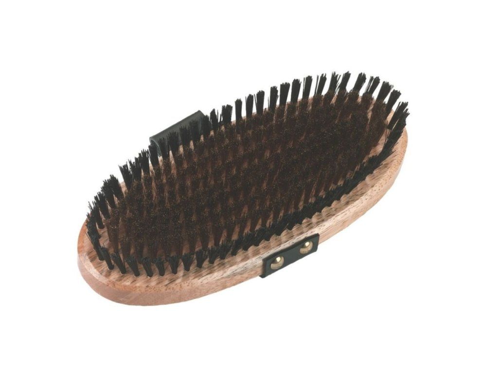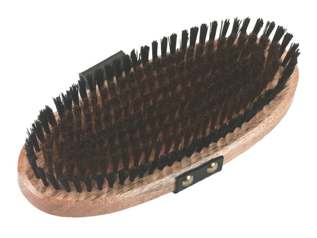 Měděné hřeblo, štětiny v 9 řadách, kožený návlek na ruku.