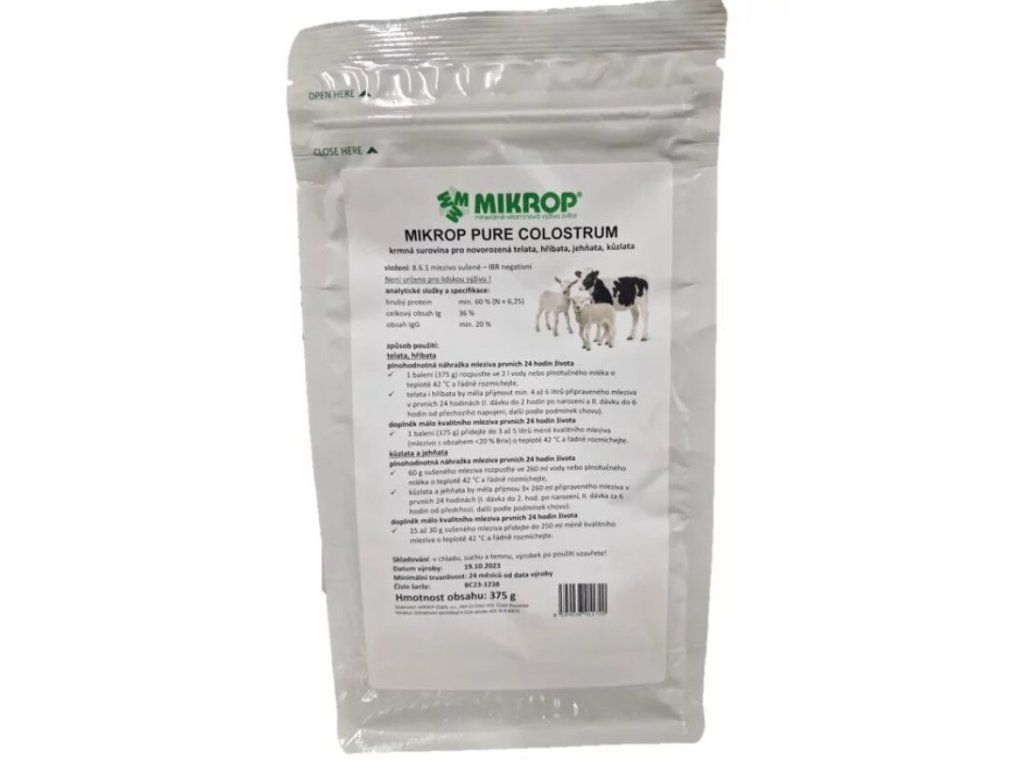 - Mikrop Pure Colostrum je 100 % sušené kravské mlezivo - mlezivová náhražka s garantovaným obsahem imunoglobulinů 36 %, resp. s obsahem IgG min. 20 %! V našem výrobku není užita jiná surovina či aditivum, mimo vlastní sušené kravské mlezivo, proto je tento produkt unikátní na trhu. Balení našeho výrobku (375 g; 1 sáček), je navrženo tak, aby při jeho aplikaci do 2 litrů vody nebo kravského plnotučného mléka, vznikly 2 litry plnohodnotné náhražky mleziva, které by tele, jehně či kůzle mělo dostat v případech, kdy nativní mlezivo od matky nebo z náhradního zdroje není k dispozici (úhyn matky, nespouštění mleziva u plemenice, zdravotní problémy matky, velmi nízká kvalita nativního mleziva apod.). V případě, kdy chovatel nemá k dispozici žádné zdroje nativního mleziva, je vhodné teleti podat v prvních 24 hodinách objem mlezivové náhražky na úrovni min. 10 %, opt. 15 % z jeho živé hmotnosti, tj. 6 a více litrů, a to minimálně ve dvou dílčích dávkách (2 x 3 litry) s tím, že první dávka by měla být podána do 2 až 3 hodin po narození telete. U jehňat a kůzlat se doporučuje podat objem mlezivové náhražky v objemu 10 až 15 % z jejich živé hmotnosti v prvních 24 hodinách života mláďat, a to v min. 2 až 3 dílčích napájení (první podání mleziva by mělo následovat nejpozději do 2 až 3 hodin po narození).