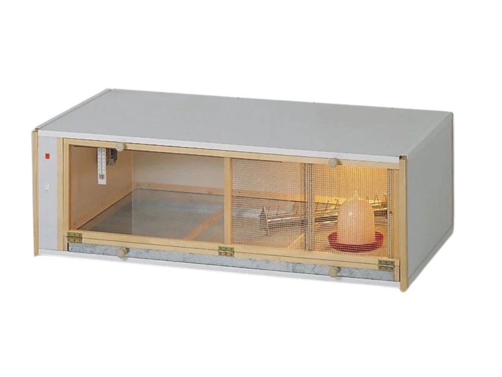 - Součástí odchovny je topné těleso umístěné pod stropem v levé části boxu, termostat s ovladačem, teploměr, osvětlení s vypínačem, krmítko a napáječka.