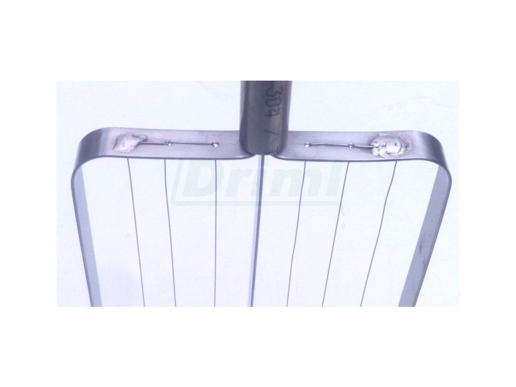 - Hrany rámečku jsou zkoseny pro snadnější krájení. Do středu rámečku je vložena výztuha (1,5x19), která je jedním koncem přivařena do rámečku a druhý konec je spojen s konci rámečku a je zasunutý do rukojetě kráječe-trubka s průměrem 22mm.