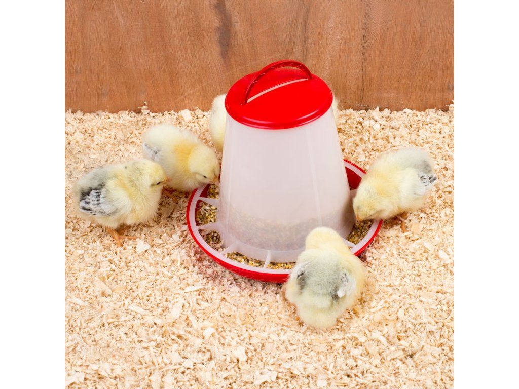 - Tubusové krmítko s přepážkami na 1 kg krmiva pro kuřata, křepelky.