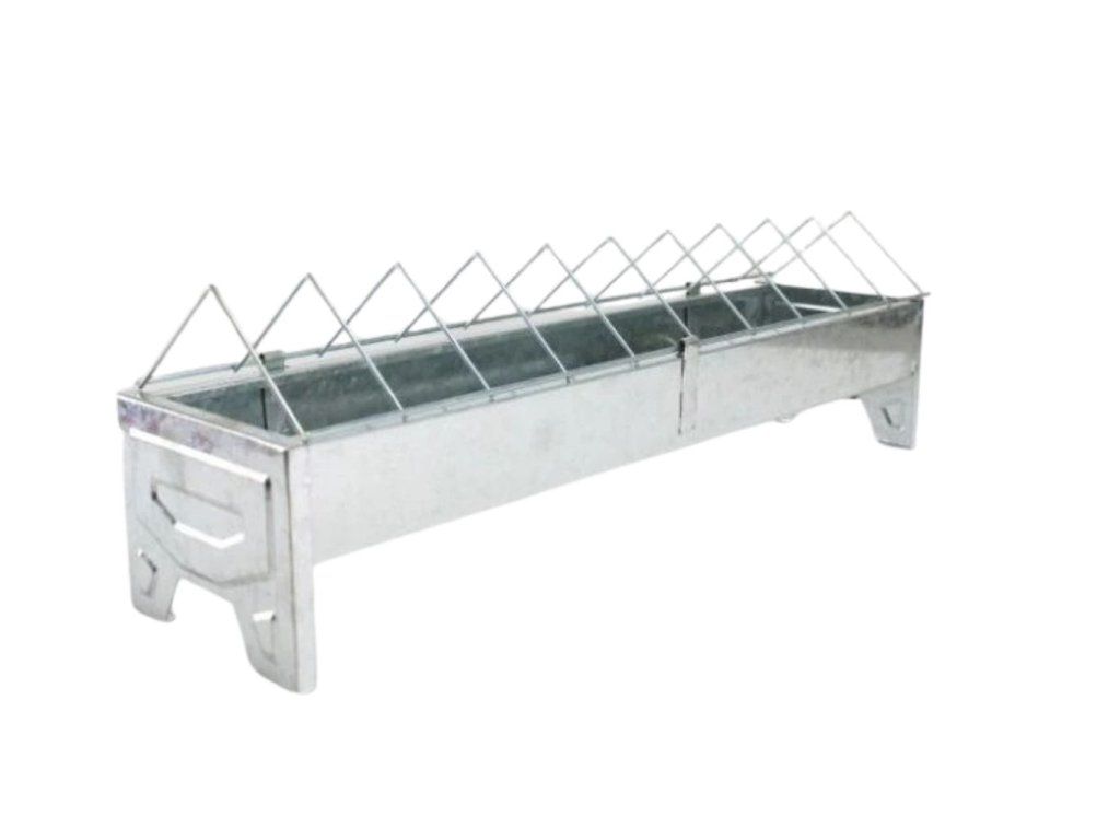 Žlabové krmítko s drátěným víkem pro drůbež.